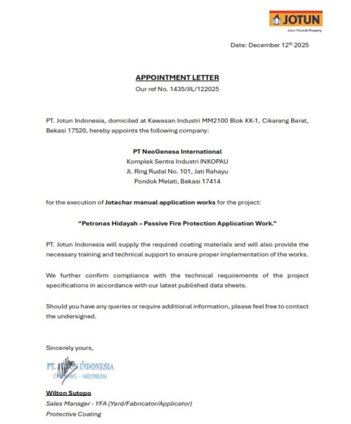 At a glance PT NeoGenesa International, we are industry among others in delivering top-tier contracting and supply services with a focus on Passive Fire Protection, Blasting and Painting, and Insulation Solutions. With a commitment to excellence and safety, we have been serving clients across Indonesia for over 15 years, ensuring that every project is completed to the highest standards.
